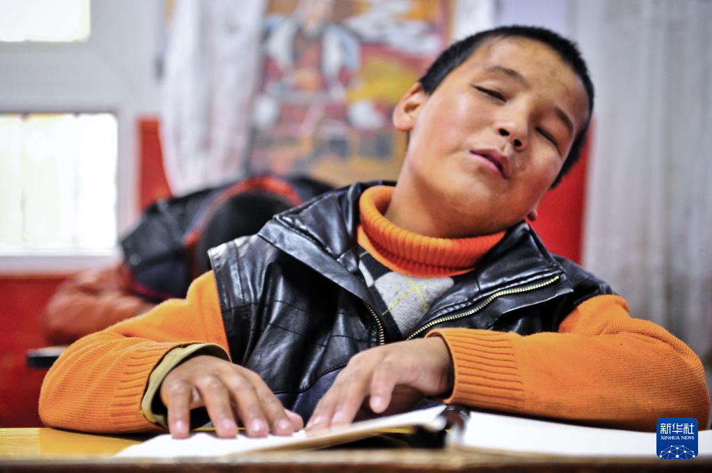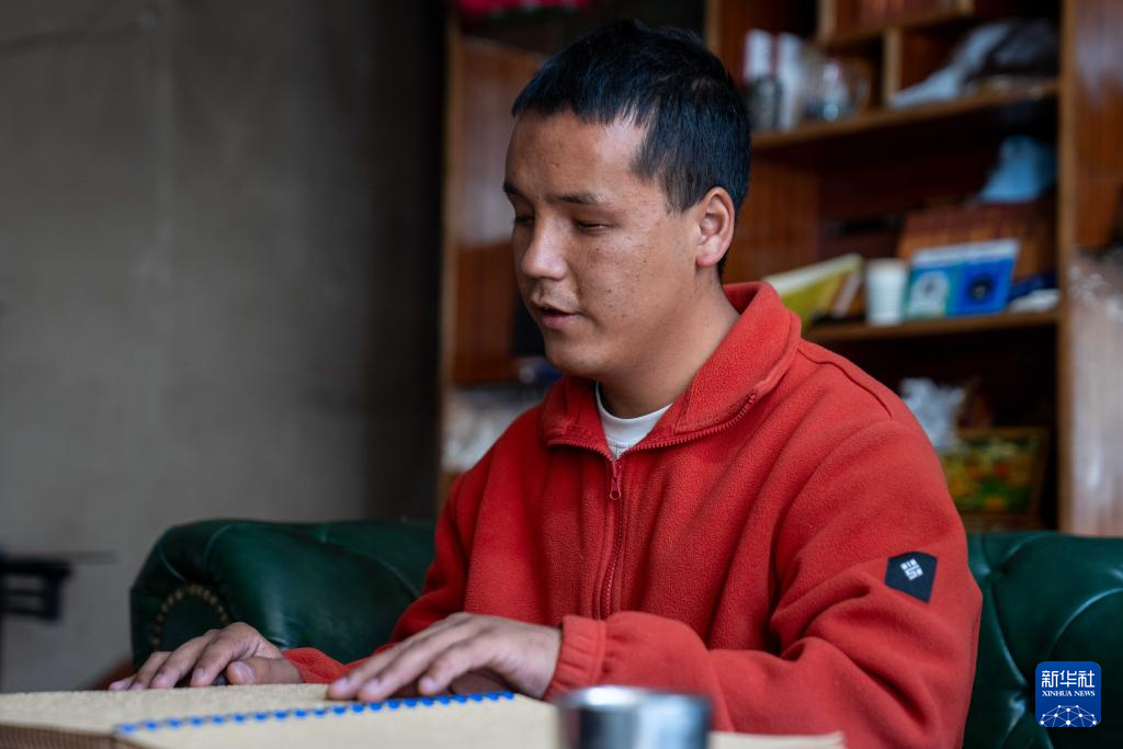 2025年10月10日,達(dá)瓦次仁在“閱讀”盲文書籍。