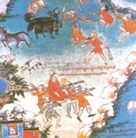在這些小邦中,有比較詳細(xì)的歷史傳說記載的是悉補(bǔ)野部落。依據(jù)古老的傳說,該部的第一代首領(lǐng)也 是吐蕃王室先祖涅赤贊普是從天界下降人間,降臨雅拉香波神山,被當(dāng)?shù)啬寥藫泶鳛橥?,由于是牧人以頸為坐椅把他抬回來的所以稱為“涅赤贊普”。而本教文獻(xiàn)則記載他是從波密一帶遷徙到瓊結(jié)地方,然后發(fā)展起來的部落首領(lǐng),由于他來自波密,因此被稱為“悉補(bǔ)野”。(恰白次旦平措等《西藏通史——松石寶串》上冊,西藏古籍出版社,1989年)涅赤贊普的時代在雅隆河谷修建了雍布拉崗的官室,說明當(dāng)時雅隆河谷已經(jīng)有了比較發(fā)達(dá)的農(nóng)業(yè)和牧業(yè)。涅赤贊普又傳到止貢贊普,在部落聯(lián)盟的內(nèi)部斗爭中,止貢贊普被屬下的小部落首領(lǐng)羅阿木達(dá)孜殺死。涅赤贊普的兩個兒子被流放到工布,其中的聶歧當(dāng)了工布的小王,夏歧舉兵報(bào)仇,奪回了王位,改名為布德貢杰,為止貢贊普修建了陵墓,并興建了瓊結(jié)的瓊瓦達(dá)孜城堡。薩迦索南堅(jiān)贊《王統(tǒng)世系明鑒》說。在布德貢杰的時代已能燒制木炭,冶煉銅、鐵、銀等金屬,還修渠引水,灌溉農(nóng)田,并且制造犁軛,用二牛共軛耕田。鐵制農(nóng)具的出現(xiàn)和使用畜力,大大提高了農(nóng)業(yè)生產(chǎn)力,因而人口增加,部落繁盛。部落聯(lián)盟的發(fā)展帶來了部落首領(lǐng)的王權(quán)的提高,在涅赤贊普時輔助贊普的是“三尚一論”,“尚”是舅氏,即親緣部落的首領(lǐng),“論”是贊普的家臣,還帶有明顯的部落聯(lián)盟的特征。到第十六代贊普岱處保南木雄贊時,開始設(shè)置了“大論”(即大相),以后又出現(xiàn)了為贊普管理收納貢賦的“岸本”(財(cái)稅官)。各個部落首領(lǐng)和貴族要向贊普盟誓,效忠贊普 臣下的官位、領(lǐng)地、屬民已被認(rèn)為是來源于贊普的封賜,如果臣下不忠,贊普可以處以刑罰,剝奪其封地和屬民;在臣下的家族發(fā)生絕嗣即沒有男性后裔繼承的情況下,其封地屬民要由贊普收回,由此確定了贊普和臣下的君臣的關(guān)系。