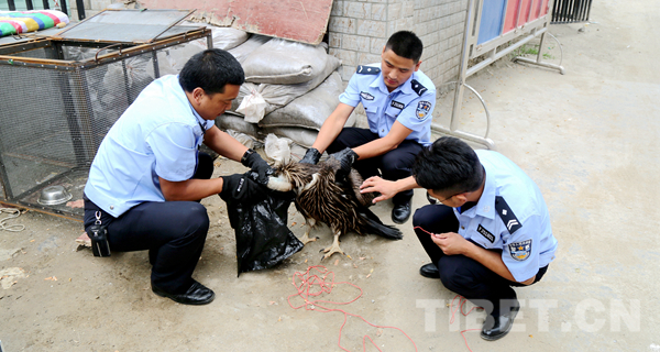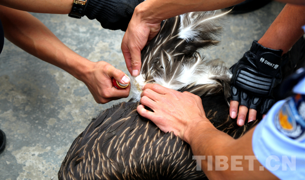 過了一會兒,正在路邊施工的工人發(fā)現(xiàn)了我,他們立即打電話。后來我才知道,他打到了丹巴縣環(huán)林局野??疲ㄟ@可是專門負(fù)責(zé)保護動物的機構(gòu)喔)。隨后,就見有穿制服的工作人員來了,救星?。∷麄兘o我檢查了身體,發(fā)現(xiàn)了我右爪脫臼傷情,就把我?guī)Щ氐搅说ぐ蜕止簿帧?/p>