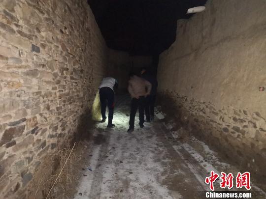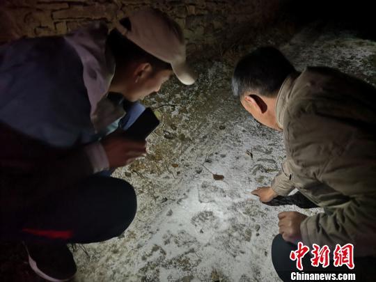 圖為青海省玉樹州稱多縣環(huán)境保護(hù)和林業(yè)局工作人員沿雪豹留下的腳印找尋蹤跡。 鐘欣 攝