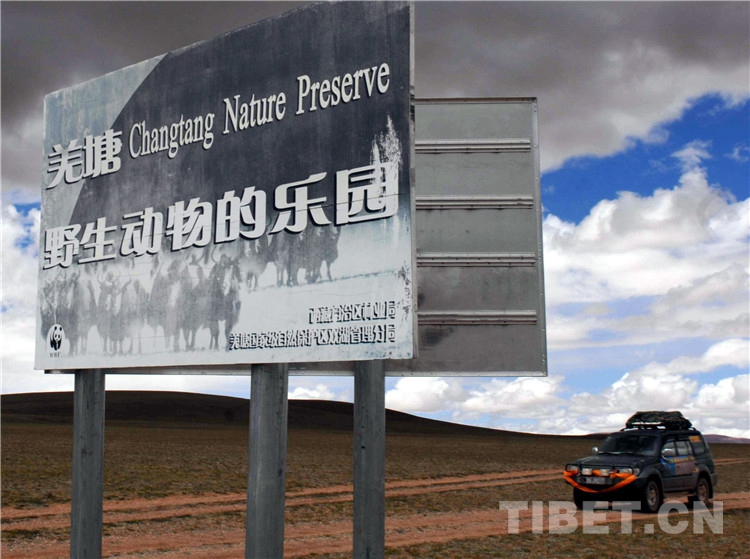 圖為一輛自駕游車輛通過羌塘國家級自然保護區(qū)的標志牌(2009年) 攝影:唐召明