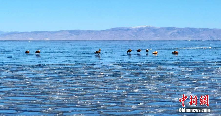 圖為野生鳥類在冰面上嬉戲。趙海梅 攝