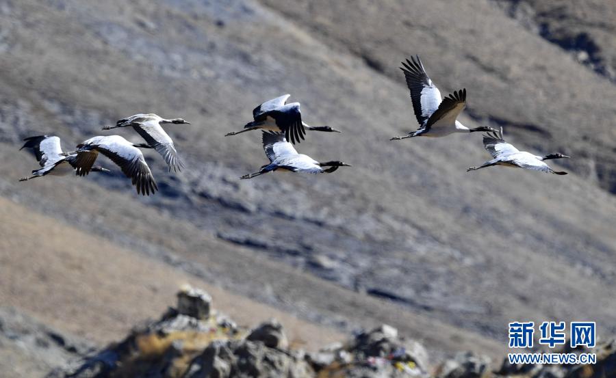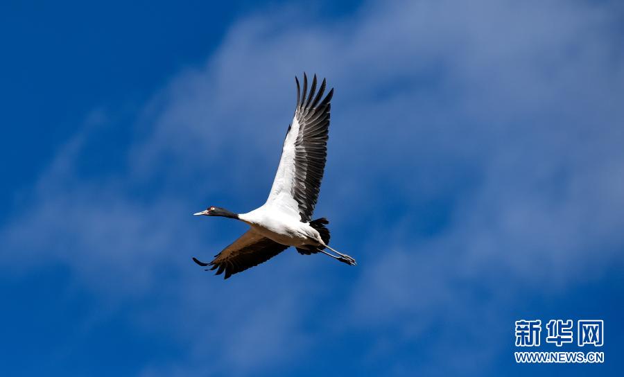 黑頸鶴在林周縣黑頸鶴自然保護區(qū)里飛翔(12月12日攝)。新華社記者 張汝鋒 攝