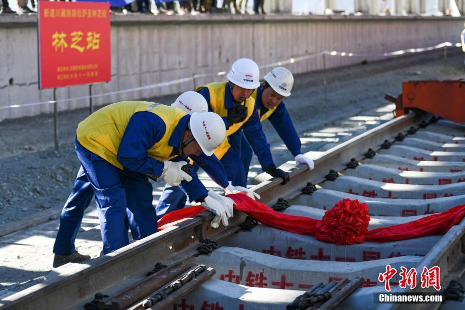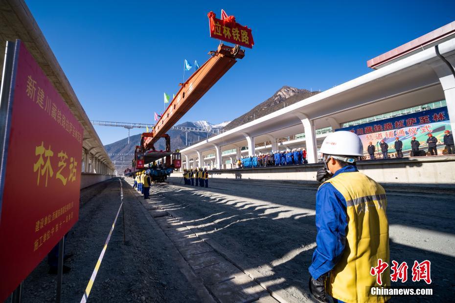 12月31日,中鐵十一局工程人員進(jìn)行軌道鋪設(shè)作業(yè)。當(dāng)日,在西藏林芝市尼洋河畔的新建林芝火車(chē)站,川藏鐵路拉薩至林芝段(拉林鐵路)最后一段軌排順利鋪設(shè),這標(biāo)志著拉林鐵路399.61公里的正線軌道全部鋪通,西藏東南地區(qū)結(jié)束無(wú)鐵路歷史。拉林鐵路起自西藏自治區(qū)首府拉薩,終點(diǎn)為林芝市,正線全長(zhǎng)435.5公里,新建正線403.1公里,系西藏首條電氣化鐵路,設(shè)計(jì)行車(chē)速度為160km/h,全線計(jì)劃于2021年6月30日建成通車(chē)。中新社記者 何蓬磊 攝