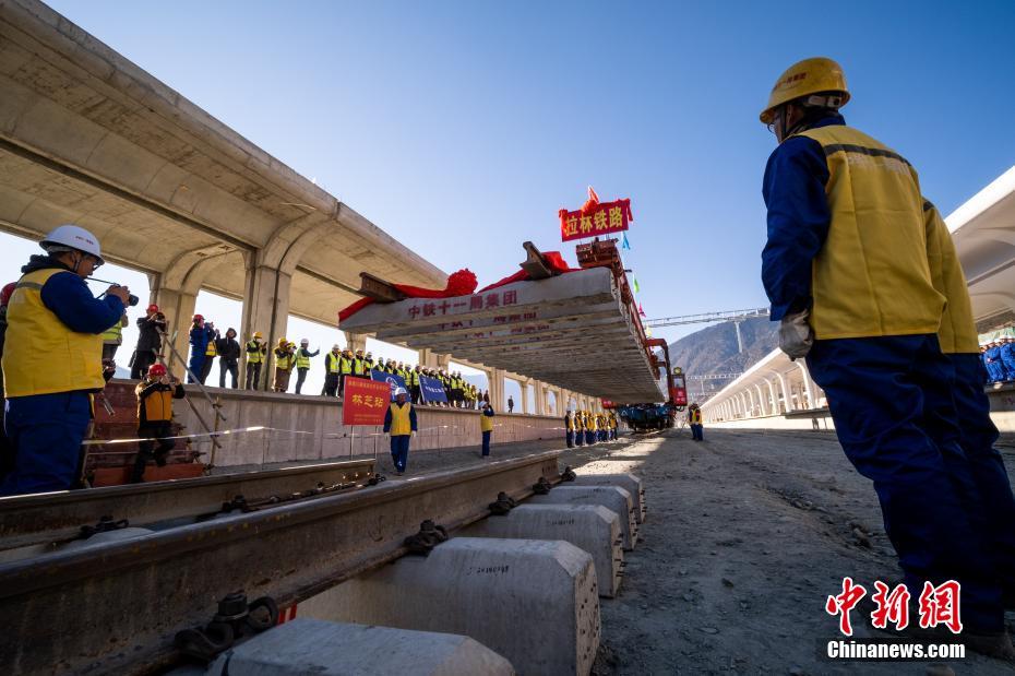 12月31日,拉林鐵路最后一段軌排鋪設(shè)現(xiàn)場(chǎng)。當(dāng)日,在西藏林芝市尼洋河畔的新建林芝火車(chē)站,川藏鐵路拉薩至林芝段(拉林鐵路)最后一段軌排順利鋪設(shè),這標(biāo)志著拉林鐵路399.61公里的正線軌道全部鋪通,西藏東南地區(qū)結(jié)束無(wú)鐵路歷史。拉林鐵路起自西藏自治區(qū)首府拉薩,終點(diǎn)為林芝市,正線全長(zhǎng)435.5公里,新建正線403.1公里,系西藏首條電氣化鐵路,設(shè)計(jì)行車(chē)速度為160km/h,全線計(jì)劃于2021年6月30日建成通車(chē)。中新社記者 何蓬磊 攝