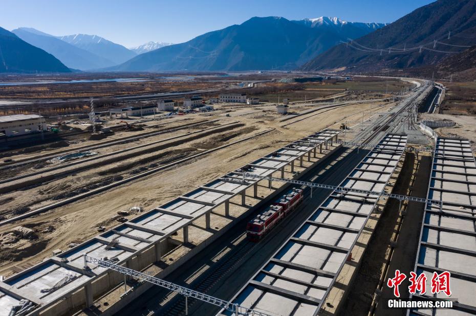 12月31日,中鐵十一局軌道車(chē)通過(guò)鋪設(shè)完成的拉林鐵路林芝站。當(dāng)日,在西藏林芝市尼洋河畔的新建林芝火車(chē)站,川藏鐵路拉薩至林芝段(拉林鐵路)最后一段軌排順利鋪設(shè),這標(biāo)志著拉林鐵路399.61公里的正線軌道全部鋪通,西藏東南地區(qū)結(jié)束無(wú)鐵路歷史。拉林鐵路起自西藏自治區(qū)首府拉薩,終點(diǎn)為林芝市,正線全長(zhǎng)435.5公里,新建正線403.1公里,系西藏首條電氣化鐵路,設(shè)計(jì)行車(chē)速度為160km/h,全線計(jì)劃于2021年6月30日建成通車(chē)。中新社記者 何蓬磊 攝