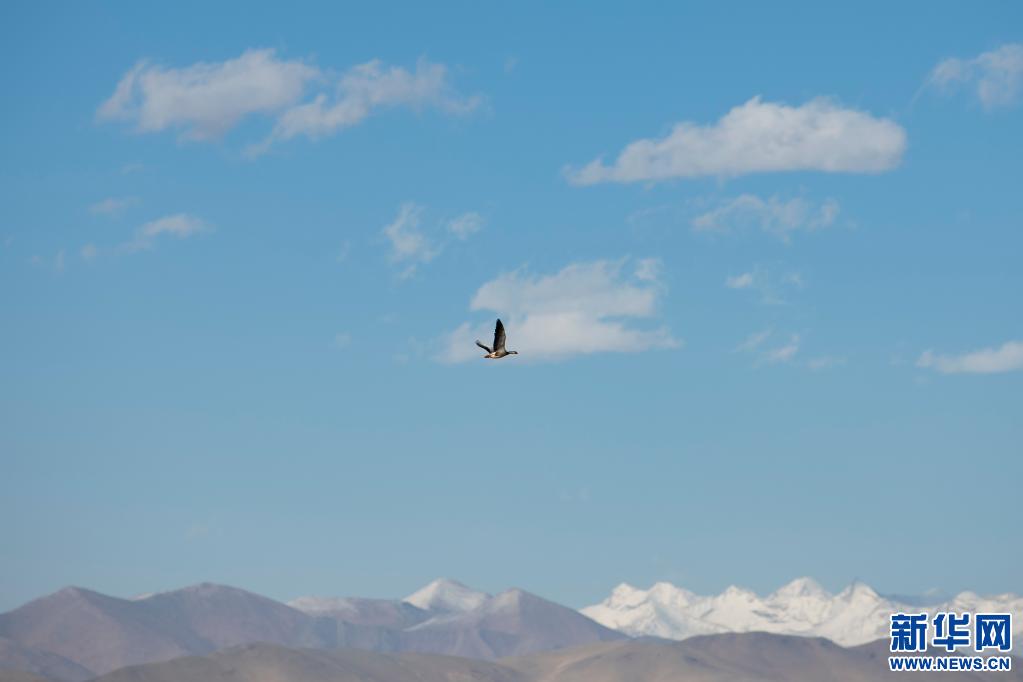 5月16日,在西藏仲巴縣里孜口岸附近,一只斑頭雁從空中飛過。新華社記者 孫瑞博 攝