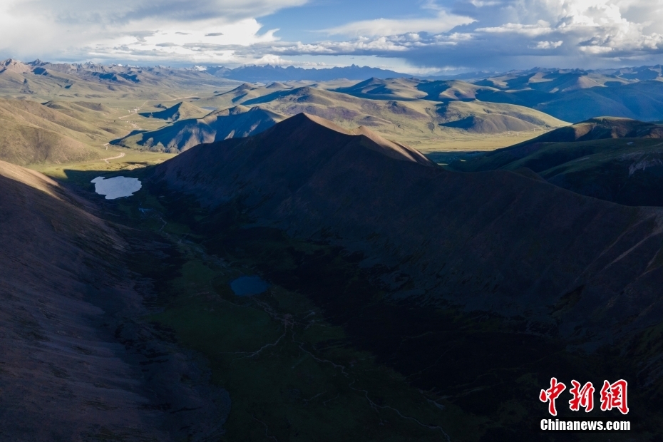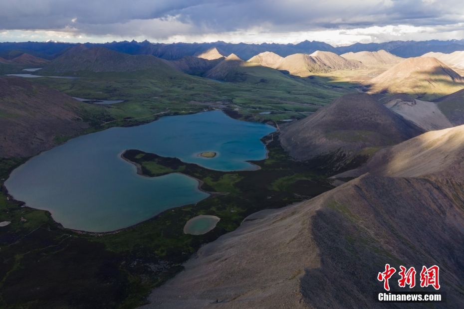 6月23日,思金拉措湖邊高原山脈風(fēng)光。思金拉措位于西藏墨竹工卡縣日多鄉(xiāng),海拔4500多米,周邊群峰簇?fù)恚匦为q如聚寶盤,不少民眾將其稱為西藏的“財(cái)神湖”。(無(wú)人機(jī)照片) 中新社記者 江飛波 攝