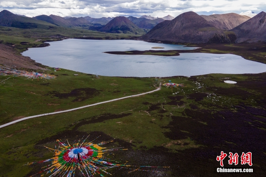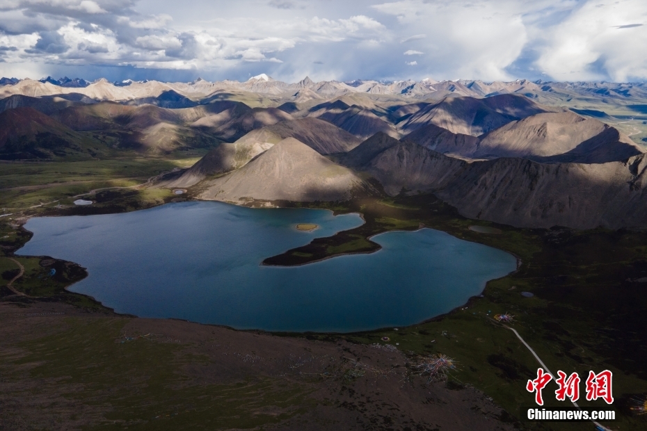 6月23日,思金拉措湖風(fēng)光秀麗。思金拉措位于西藏墨竹工卡縣日多鄉(xiāng),海拔4500多米,周邊群峰簇?fù)恚匦为q如聚寶盤,不少民眾將其稱為西藏的“財(cái)神湖”。(無(wú)人機(jī)照片) 中新社記者 江飛波 攝