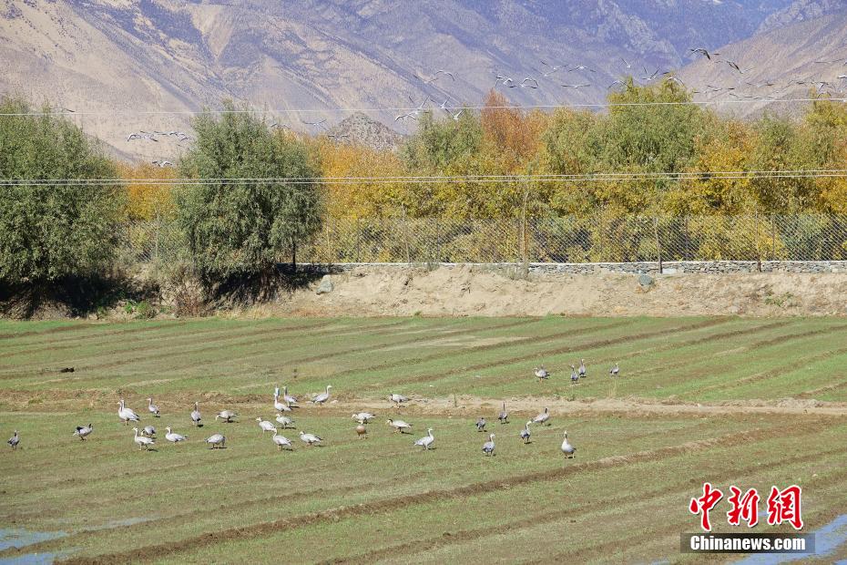 圖為11月12日,斑頭雁等鳥類在西藏山南市扎囊縣境內(nèi)的農(nóng)田覓食。冉文娟 攝