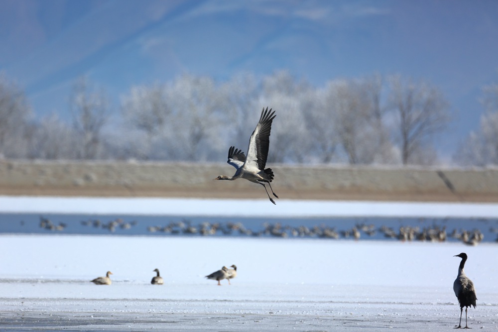 黑頸鶴是國家一級保護動物。近年來,隨著當?shù)厣鷳B(tài)保護力度越來越大,每年11月前后至次年3月底,來林周縣越冬的候鳥越來越多。為保護黑頸鶴,林周縣出臺系列措施,專門設(shè)立多個定期投食點,安排專人投撒青稞、小麥等黑頸鶴所需食物;成立巡護隊,嚴格實行24小時巡護制度。