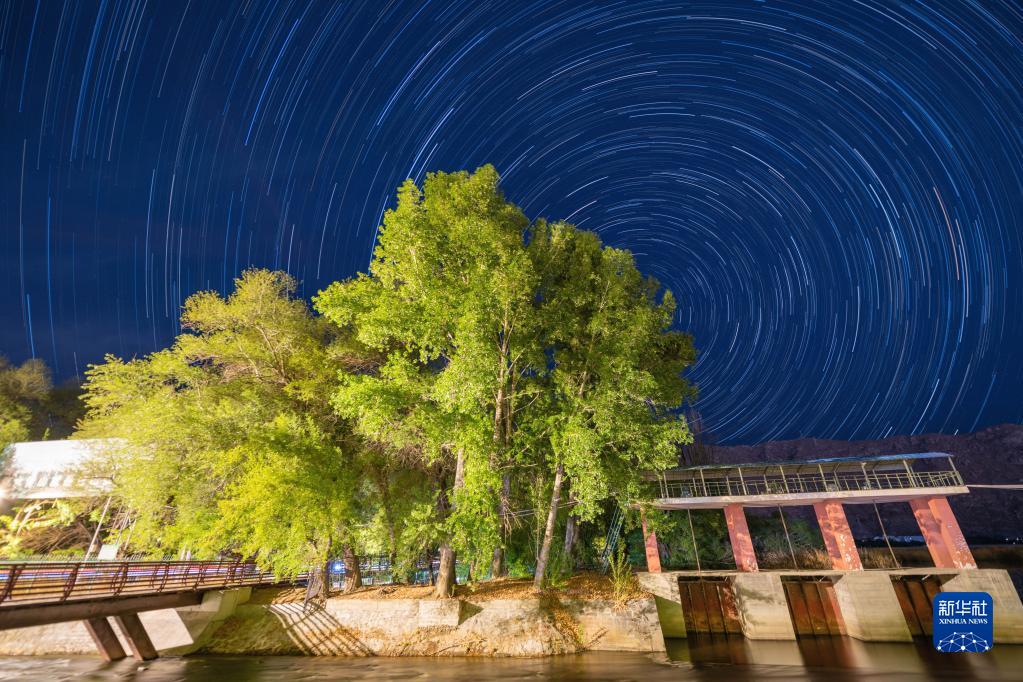 5月4日在拉薩河畔拍攝的星軌(合成照片)。新華社記者 周荻瀟 攝