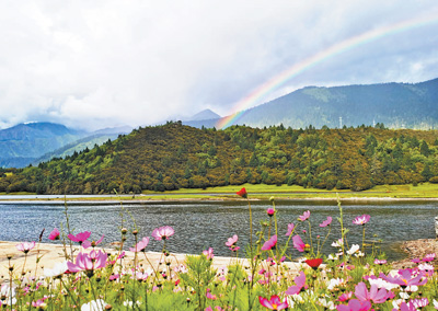 夏日的魯朗鎮(zhèn),溪水潺潺,鮮花盛開,藏式村寨點綴其間,勾畫出一幅恬靜、優(yōu)美的“高原山居圖”。