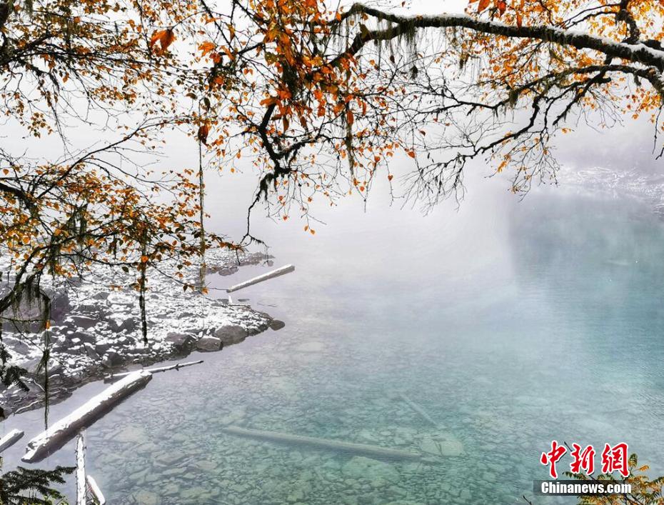 十月,九寨溝長海、原始森林等景點迎來入秋后的第一場雪。澄凈碧藍的海子和金色的彩林與潔白的雪花相映相襯,構成一幅靜謐的美麗畫卷。遠遠看去,成片的彩林被一朵朵雪花點綴,美得像童話世界一般。 梁峰 攝
