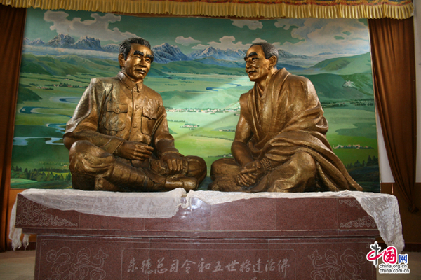 圖為甘孜自治州白利寺,五世格達(dá)活佛紀(jì)念館,陳列著紅軍總司令朱德和五世格達(dá)活佛促膝長談的塑像。