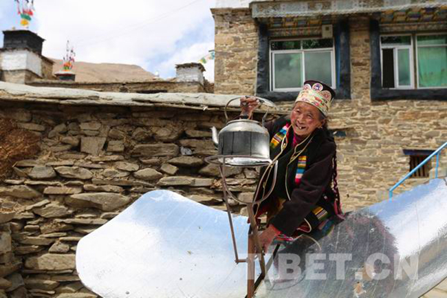 圖為姐姐西洛卓瑪在自家院子里的太陽(yáng)灶上燒水