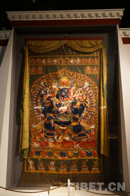 展覽專辟了一個(gè)區(qū)域展示西藏唐卡畫的發(fā)展衍生。其中,有一幅明永樂年間的刺繡大威德金剛唐卡堪稱“明星展品”。這幅高約4.3米的唐卡針線細(xì)膩,色彩鮮艷,造型生動(dòng),為密針疊線繡制手法。