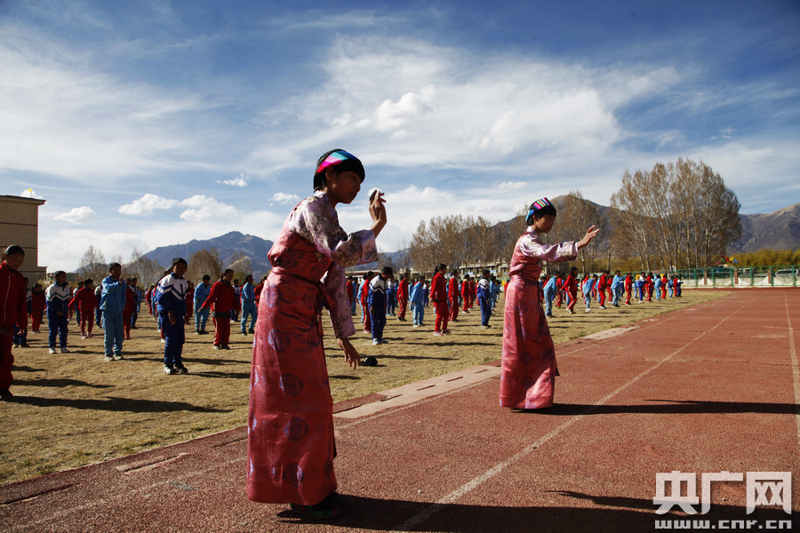 山南素有“果諧之鄉(xiāng)”的美稱,該市扎囊縣的“扎囊果諧”曲調(diào)獨具特色,激情熱烈,具有很強的感染力,2006年被列入西藏自治區(qū)非物質(zhì)文化遺產(chǎn)名錄。為更好地傳承這一民間舞蹈,扎囊縣從2013年開始在校園推廣這種新式課間操。圖為兩名藏族女孩帶領(lǐng)數(shù)百名扎囊縣中學(xué)學(xué)生跳起“果諧舞”課間操。圖片來源:央廣網(wǎng)
