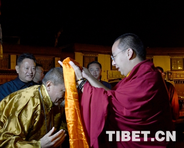 十一世班禪乘車抵達(dá)大昭寺時(shí)法號(hào)齊鳴、鼓樂(lè)喧天。早已迎候在此的中國(guó)佛協(xié)西藏分會(huì)會(huì)長(zhǎng)珠康?土登克珠向十一世班禪敬獻(xiàn)哈達(dá),表達(dá)僧眾對(duì)他的衷心擁戴。