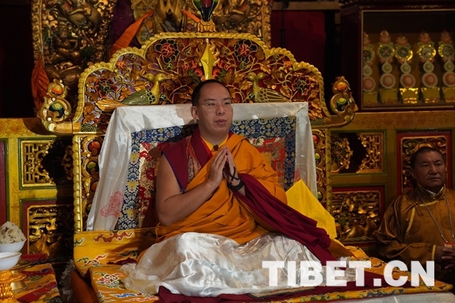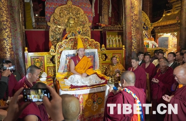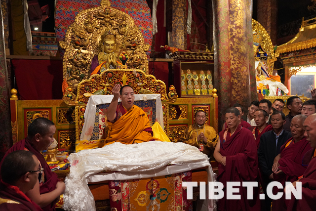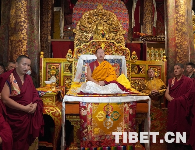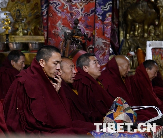 朝拜結(jié)束后,十一世班禪登上設(shè)在釋迦牟尼佛像正對(duì)面的寶座上,面朝佛像,帶領(lǐng)眾僧念誦經(jīng)文,祈愿五谷豐登、國(guó)泰民安、世界和平。