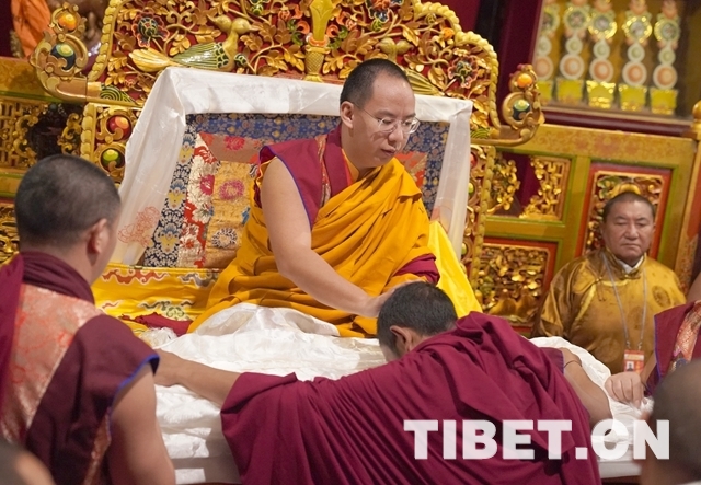 圖為按照藏傳佛教傳統(tǒng),大昭寺高僧為十一世班禪敬獻(xiàn)吉祥曼扎等。攝影:王淑。
