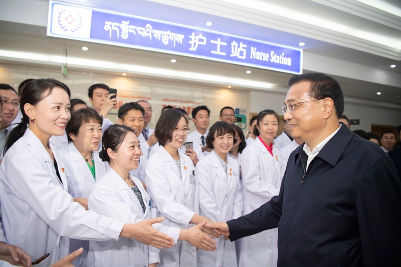 7月27日,李克強(qiáng)總理來(lái)到西藏自治區(qū)人民醫(yī)院,看望慰問(wèn)援藏醫(yī)護(hù)人員。來(lái)源:中國(guó)政府網(wǎng)
