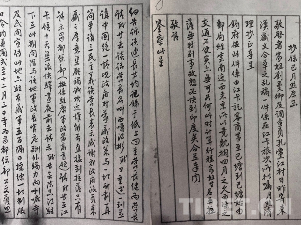 1929年(民國十八年)8月1日,劉曼卿一行從上海出發(fā),開始為期近一年的西藏之行。行至芒康時,劉曼卿寄給其妹劉曼云(藏文名為:巴月照)一封漢藏文合并的字跡潦草的文稿,并囑咐她整理抄正后轉(zhuǎn)呈國民政府。此封文稿是劉曼卿行至江卡,就是現(xiàn)在的芒康地方時擬就的,記述了劉曼卿一行到該地后沿途的經(jīng)過情形。因為當時的通信很不便利,劉曼卿托芒康的客商將這封信帶到巴塘,又由巴塘的郵局經(jīng)云南發(fā)往南京。輾轉(zhuǎn)四個月之久,這封信才寄到劉曼云手中,而此時已是民國十九年的3月份了。