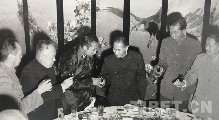 圖為1959年4月29日,中央駐藏代表張經武在北京飯店舉行宴會,慶祝西藏自治區(qū)籌備委員會成立三周年。右起:賀龍、阿沛?阿旺晉美、張經武、十世班禪、陳毅、烏蘭夫。