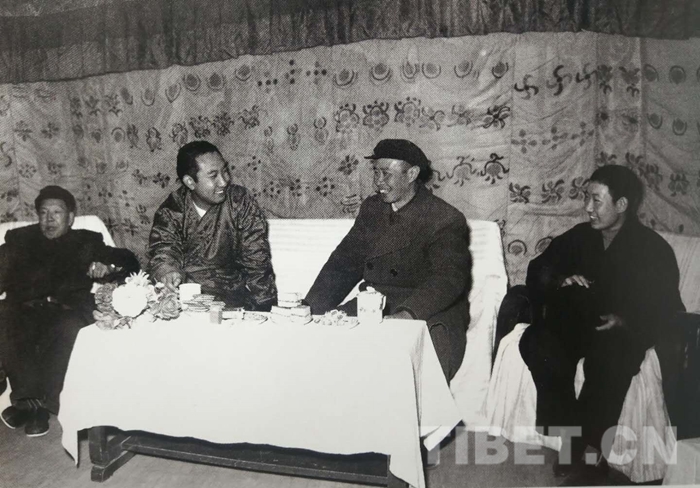 1960年2月16日,西藏自治區(qū)籌委會代理主任十世班禪(左二)、西藏自治區(qū)籌委會副主任帕巴拉?格列朗杰(右一)在北京參加建國十周年慶祝活動并在內地參觀后回到拉薩。圖為張經武(右二)與十世班禪等親切交談。