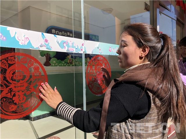 圖為愛心媽媽貼窗花。