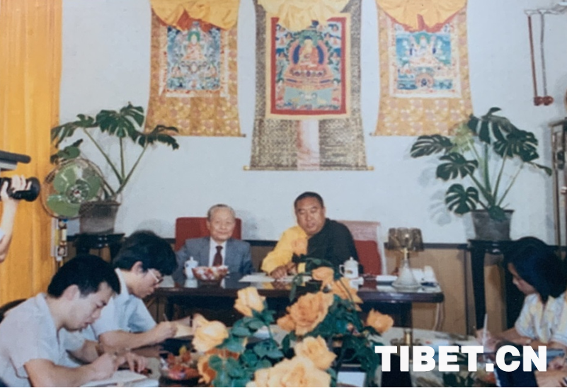 圖為1987年,十世班禪和趙樸初在中國藏語系高級佛學院成立儀式新聞發(fā)布會上接受媒體采訪。