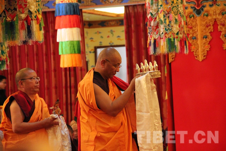 紅墻蒼松,佛塔嵯峨。上午九點,西黃寺陽光樓內(nèi),正中安放法座,左側(cè)供案上安奉著十世班禪和十一世班禪的法像,四周擺滿了鮮花和供果,大殿內(nèi)氣氛莊嚴(yán)肅穆。