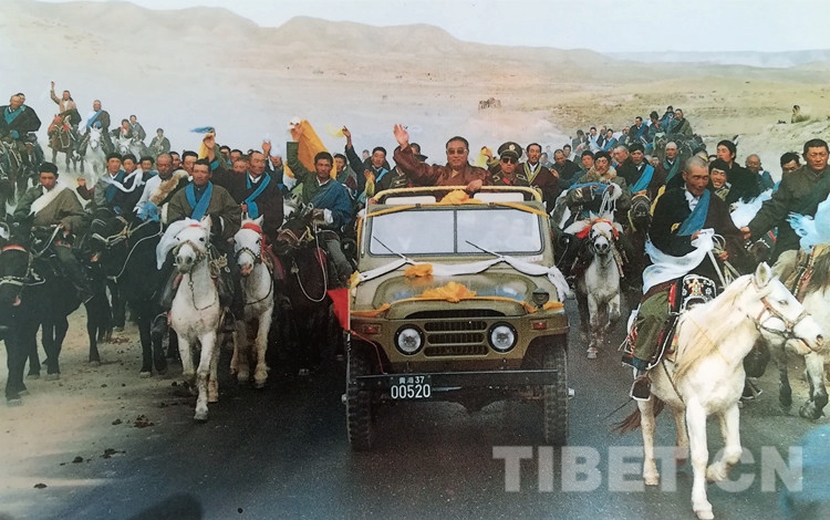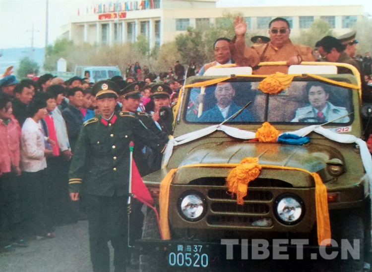 當(dāng)十世班禪大師在原青海省人大常委會副主任夏茸尕布、原海南州委書記東主加的陪同下,乘敞篷車從幸福灘來到海南州州府所在地恰卜恰鎮(zhèn)時,各族人民群眾身著節(jié)日盛裝,載歌載舞,熱烈歡迎十世班禪大師。十世班禪神采奕奕,精神飽滿,高興地向各族群眾招手致意。