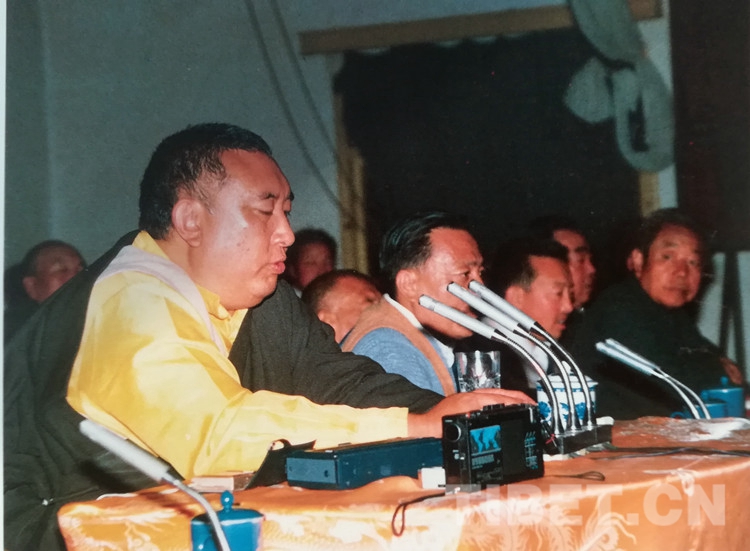 圖為十世班禪大師向海南州各族人民傳達(dá)黨和政府的親切慰問,宣傳黨的民族政策和宗教政策。
