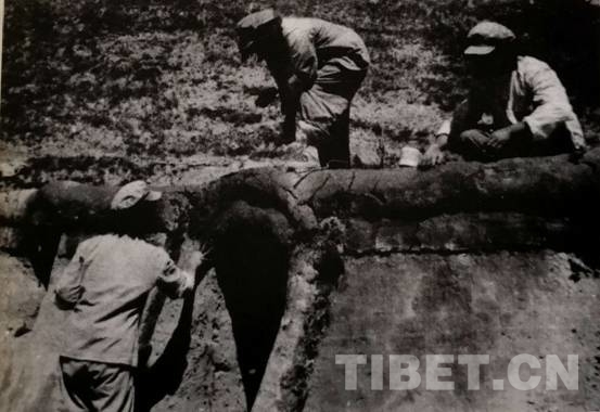 隨后,根據(jù)領(lǐng)導(dǎo)指示,各大隊(duì)沿山坡兩邊挖掘坑洞。4月的甘孜,有些凍土還沒(méi)化,必須先點(diǎn)燃草根將土層凍土融化,才比較好挖土地。接著是準(zhǔn)備修建窯洞所需的“建筑材料”,到離宿營(yíng)地?cái)?shù)十里外的山林里砍樹(shù)。用這些木材鋪?lái)敚厦驿伾蠋づ癫?,再堆上泥土。這樣建成的窯洞,倒也冬暖夏涼。修建窯洞群的戰(zhàn)士們頗為自豪地稱其為“康藏大廈”。