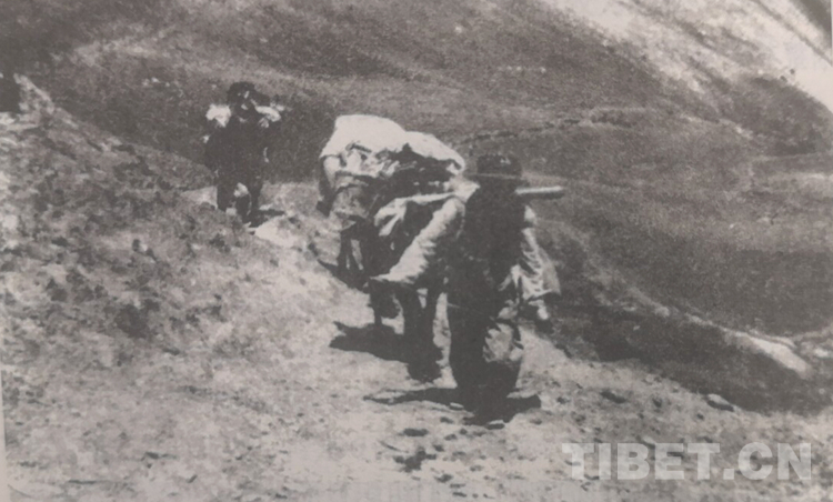 康藏工作隊(duì)的30個(gè)人分成了三個(gè)分隊(duì),每一個(gè)分隊(duì)又分三個(gè)組,一個(gè)組負(fù)責(zé)搭帳篷,一個(gè)組負(fù)責(zé)放牛,一個(gè)組負(fù)責(zé)做飯。李國(guó)柱被分到了炊事組,專門給班里的戰(zhàn)士們做飯?!按妒掠镁叨加晌冶常Z食大家分頭背。沒有灶,三塊石頭一搭就是灶。那時(shí)候吃飯很簡(jiǎn)單,沒有什么菜,就是一點(diǎn)干菜,用水泡發(fā)后煮一煮,再就是煮點(diǎn)米吃,后來(lái)米也沒有了,只有野菜,或是煮一些死牦牛的肉,因?yàn)椴窕鹛?,也煮不爛,大家吃得牙齒都不好了。那時(shí)燒柴困難,一到宿營(yíng)地,大家就分頭去拾牛糞和樹枝,但這些都不夠干,不容易點(diǎn)著。于是我就每天跪在地上不停地吹,煙熏得眼睛周圍到處都是,本來(lái)就有慢性喉炎,長(zhǎng)期受凍、煙熏,導(dǎo)致嗓子一路都是嘶啞的。走一路,總是跪在地上吹火,僅有的一身衣服的棉花都是開著的,全部磨爛了。”
