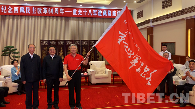 隨后,中央統(tǒng)戰(zhàn)部斯塔同志和四川省委副書記鄧小剛為十八軍后代代表張小軍和譚齊峪授旗,標志著重走十八軍進藏路活動正式拉開帷幕。