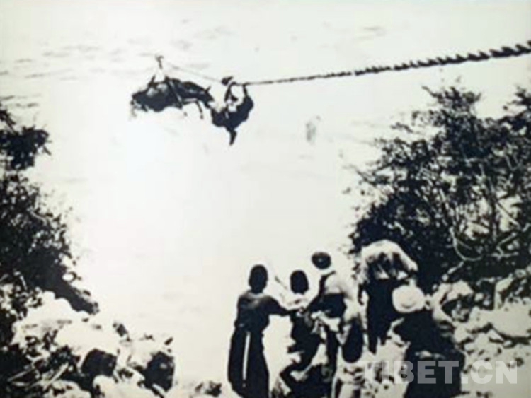圖為背夫們渡河時(shí)使用溜索。