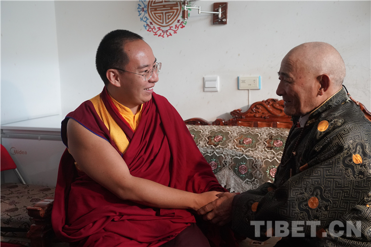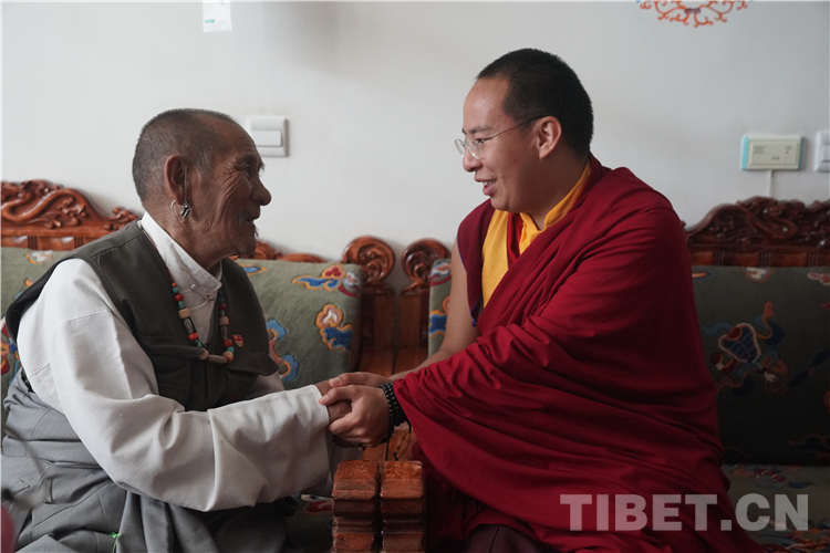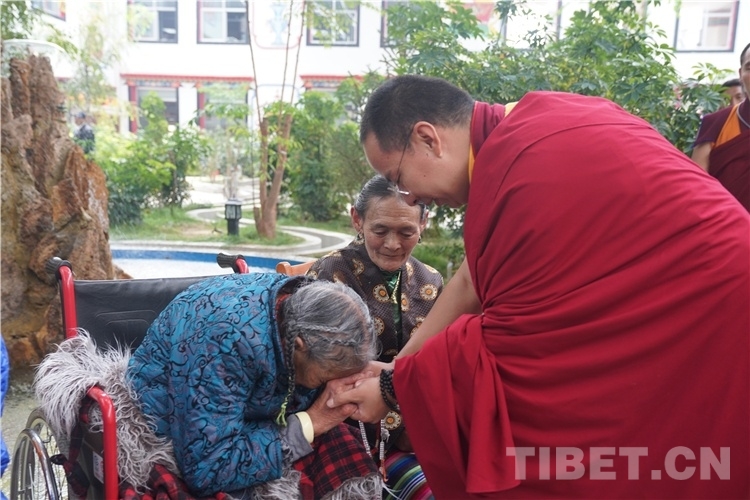 十一世班禪在參加各項(xiàng)活動(dòng)期間,專程看望阿里地區(qū)“雙集中”供(收)養(yǎng)服務(wù)中心的老人和孩子們,并為每一位老人摸頂賜福,噓寒問(wèn)暖,給老人和孩子們帶去了親人般的關(guān)懷。一位老阿媽(嬤啦)當(dāng)場(chǎng)緊緊拉著十一世班禪的手放在自己的額頭,感動(dòng)流淚,嘴里不停地說(shuō)“突吉其,突吉其”(謝謝!謝謝?。J皇腊喽U和老人們圍坐在一起飽含深情地說(shuō):“在黨中央的關(guān)心關(guān)懷下,老人家弱有所扶、老有所養(yǎng)、病有所醫(yī)、住有所居,這充分體現(xiàn)了社會(huì)主義制度的無(wú)比優(yōu)越性,看到你們健康幸福的生活我很欣慰,我會(huì)為你們祈禱,我會(huì)再來(lái)看望你們。”充滿溫情的一幕使在場(chǎng)人員無(wú)不動(dòng)容。