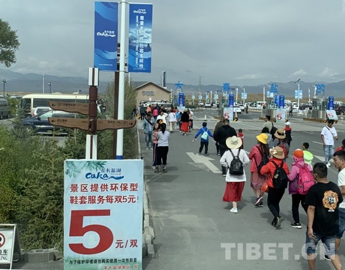 2019年8月5日,記者在茶卡鹽湖景區(qū)看到,游客們正在井然有序地排隊(duì)等候購票進(jìn)入園區(qū),道路交通秩序良好,停車場(chǎng)車輛整齊停放,“環(huán)保型鞋套服務(wù)5元一雙”的租賃標(biāo)識(shí)十分醒目,此外,咨詢服務(wù)區(qū)、票務(wù)服務(wù)區(qū)、游客集散地、產(chǎn)品展銷區(qū)等八個(gè)功能區(qū),為游客們提供了旅游餐飲、旅游互動(dòng)體驗(yàn)等多位一體的旅游綜合服務(wù)。