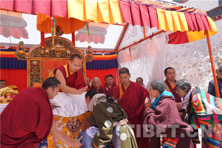 得知十一世班禪要來(lái),草原上的信教群眾把家中最華貴的衣服都穿在了身上。摸頂中,有信眾請(qǐng)十一世班禪吹一吹眼睛或撫摸傷痛處,十一世班禪總會(huì)盡心滿足。