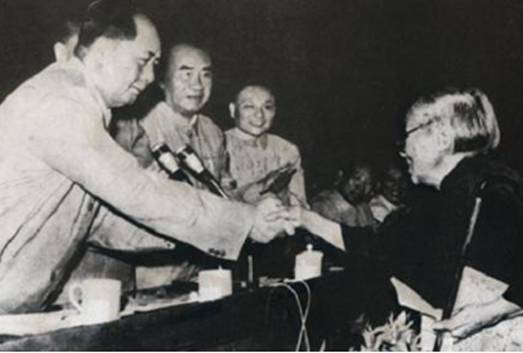 1961年7月1日,在慶祝中國共產黨成立40周年紀念會上,何香凝代表各民主黨派、無黨派民主人士、工商聯(lián)獻詞。圖為講話后,毛澤東和她握手 圖片來源:人民網(wǎng)