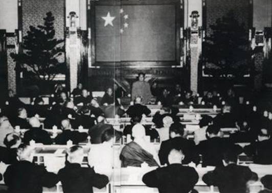 1954年12月21日,全國政協(xié)二屆一次會議在京舉行。會議修改了政協(xié)章程。圖為大會主席臺。左起:郭沫若、李濟深、毛澤東、周恩來、沈鈞儒、陳叔通 圖片來源:人民網(wǎng)
