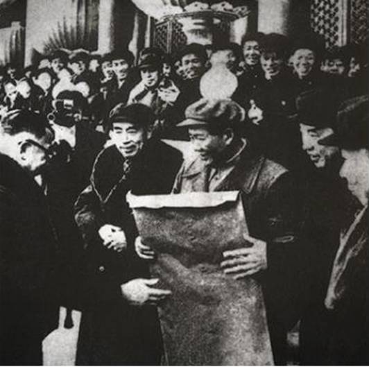 圖為1956年1月15日,北京市實現(xiàn)全行業(yè)公司合營,民建中央常委樂松生代表北京工商界在天安門城樓向毛澤東主席報喜 圖片來源:人民網(wǎng)