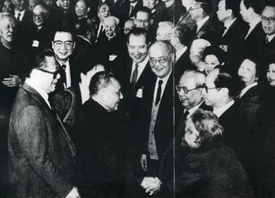 1990年2月,鄧小平、江澤民、李鵬、萬里會(huì)見香港基本法起草委員會(huì)全體委員時(shí),與參加委員會(huì)的雷潔瓊、費(fèi)孝通等握手。各民主黨派有數(shù)十位專家、學(xué)者分別參加了香港和澳門基本法起草委員會(huì),為貫徹“一國兩制”方針和香港、澳門回歸祖國做了許多工作 圖片來源:人民網(wǎng)
