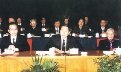 1995年12月,中共中央政治局常委朱镕基代表中共中央出席中國民主促進(jìn)會(huì)成立50周年大會(huì)并致賀詞。圖為大會(huì)主席臺(tái),前排左起:溫家寶、朱镕基、雷潔瓊 圖片來源:人民網(wǎng)(中國西藏網(wǎng) 綜合/孫健 吳建穎)