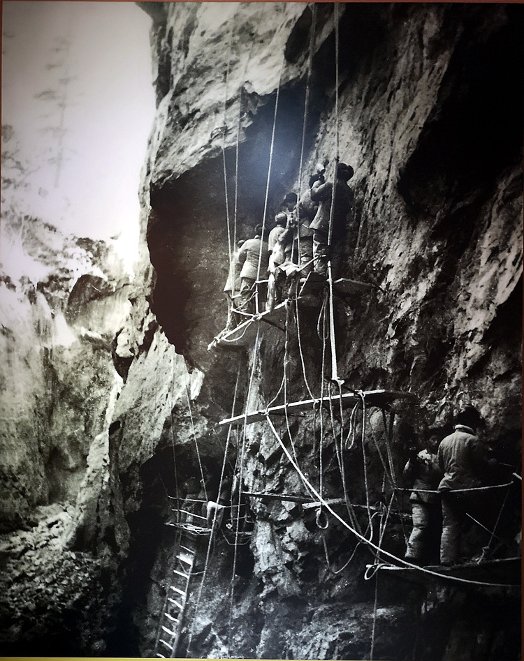 圖為懸空打炮眼。在峰巒險峻的雀兒山開鑿石方,全靠人工用鋼針打眼、放炮。翻拍:李元梅