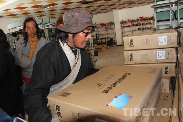 儀式結束后,各鄉(xiāng)鎮(zhèn)干部分別將電視機運到幾十公里、上百公里外的農(nóng)牧區(qū),開始挨家挨戶發(fā)放電視機。理塘縣委宣傳部組織志愿者前往部分貧困群眾家中,為他們檢查“戶戶通”信號接收設備情況,安裝調(diào)試電視機,以便讓農(nóng)牧民群眾盡快看上電視。