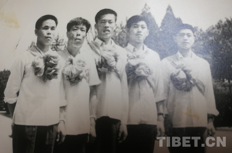 圖為1978年8月,山東師范大學(xué)舉行儀式歡送劉慶慧(左一)和4名同學(xué)志愿赴藏工作