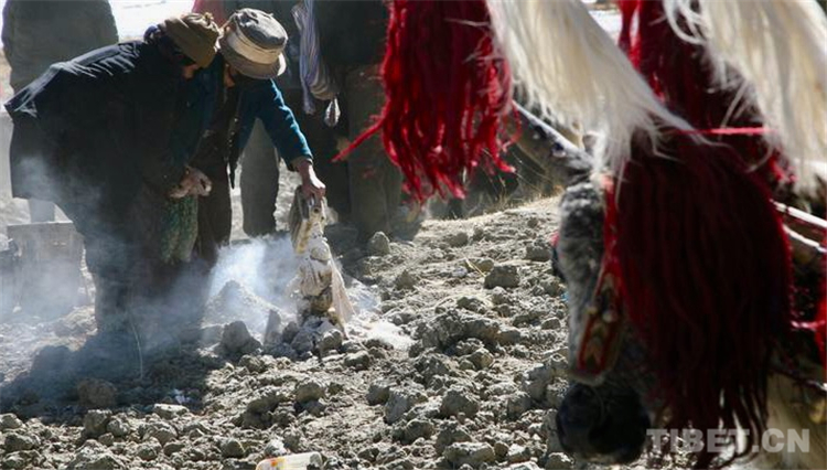 婦女們和沒(méi)有參賽的男人們?cè)谔镞叾焉习刂Α⑸锨囡?、澆上青稞酒,然后點(diǎn)燃,進(jìn)行煨桑祈福。